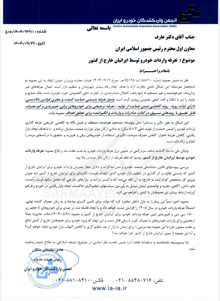 هادی سلیمانی ملکان، رییس هیأتمدیره انجمن واردکنندگان خودرو ایران، در نامهای خطاب به محمدرضا عارف، معاوناول رییسجمهور، با انتقاد صریح از مصوبه اخیر هیأت وزیران درباره تعرفه واردات خودرو توسط ایرانیان خارج از کشور، اعلام کرد؛ این تصمیم نهتنها به تنظیم بازار خودرو کمکی نمیکند، بلکه پیام افزایش شدید تعرفهها در سال ۱۴۰۵ و بیتوجهی به خودروهای کممصرف و برقی را به بازار مخابره میکند.